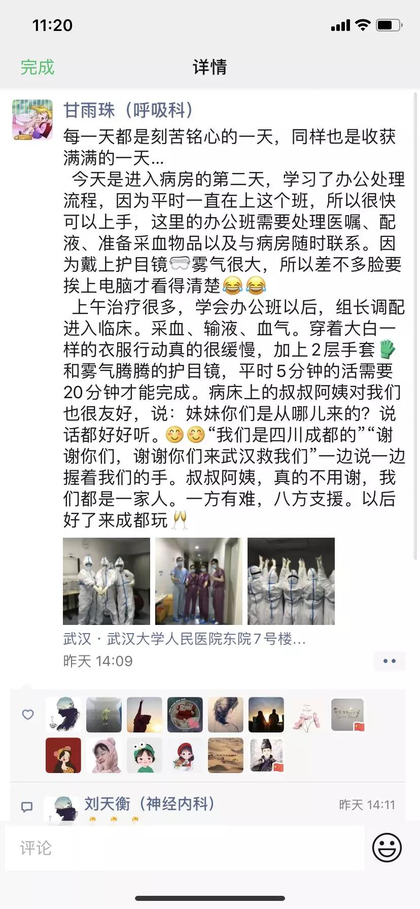 成都大学附属医院援鄂医务人员甘雨珠在朋友圈记录一天的工作