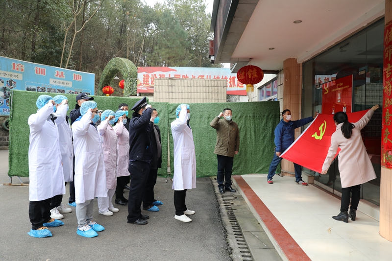 1月28日,在泸州市龙马潭区安宁街道新型冠状病毒九狮隔离留观点内,该隔离观留点内的党员医护人员正在党旗下重温入党誓词,展示防疫一线医护人员昂扬向上的工作风貌和坚决打赢疫情防控战的决心和信心。