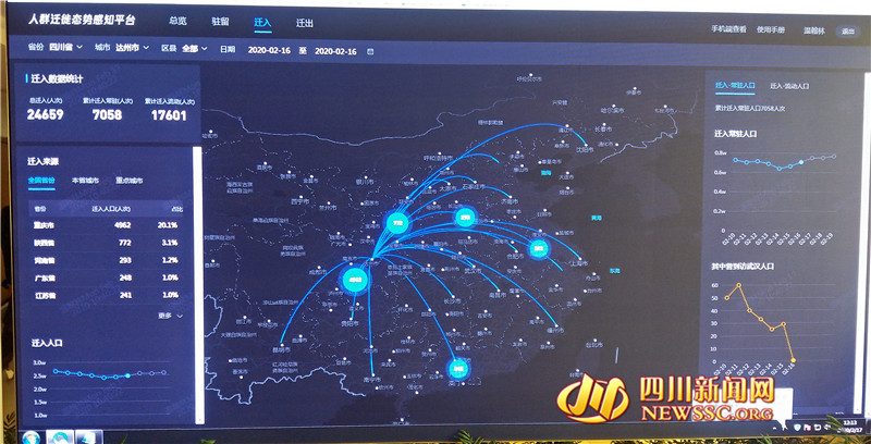 四川新闻网达州2月18日讯(记者 余开洋 摄影报道)2月18日,记者来到达州市大数据管理局,楼间的一块大屏幕引起了我们的注意,上面实时显示着迁入迁出达州人口的数量统计、来源城市、去向分布等各项数据。记者了解到,近一个月来,达州市累计迁入总人口329万,其中迁入常驻人口48万人次,流动人口281万人次;累计迁出总人口358万人次,其中迁出常驻人口65万人次,流动人口293万人次。正是通过这些大数据结合,达州实现了全局和局部重要信息透明,为疫情防控集中统一指挥提供精准突破方向和全程辅助决策。
