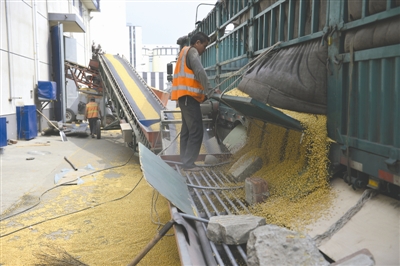 工人将大豆入库