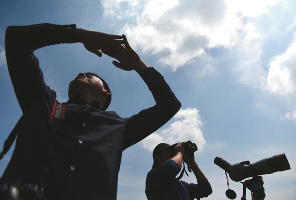 4月8日上午,成都龙泉山简阳段一处山脊上,阳光照得人睁不开眼。来自成都观鸟会的邹滔和朱磊等人一字排开,抬头望天,等候猛禽飞过。