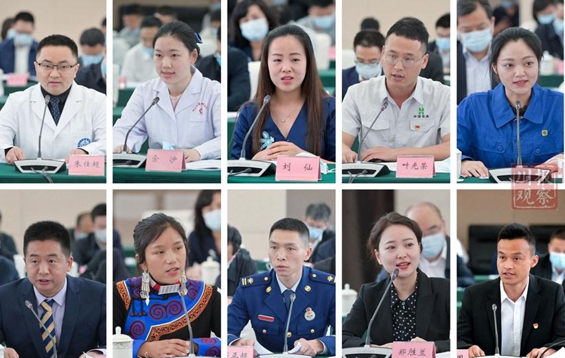 座谈会上,朱仕超、佘沙、刘仙、叶光荣、唐成凤、马权、莫色小兰、侯正超、郑胜兰、刘兴国等10位青年代表作交流发言。他们中有主动请缨投身抗疫一线的青年医务工作者,有以志愿精神传递爱与希望的青年志愿者,还有长期扎根基层、奋战在各行业各战线的青年标兵。大家结合成长经历和各自工作实际,谈思想认识、工作感悟和意见建议。