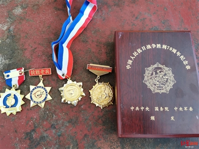 在李开国老人的家中,有一枚珍藏的由中共中央、国务院、中央军委颁发的“中国人民抗日战争胜利70周年纪念章”。李开国的儿子李朝红告诉记者,当天,老人被江油市政府部门请到了江油喝茶、看电视、吃饭,还发了5000元慰问金。