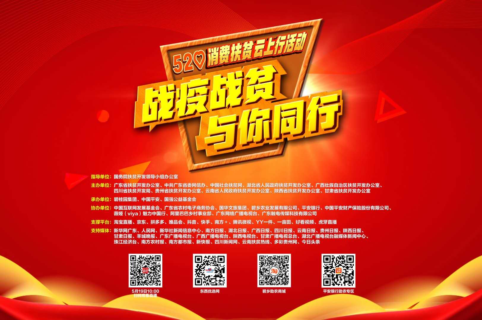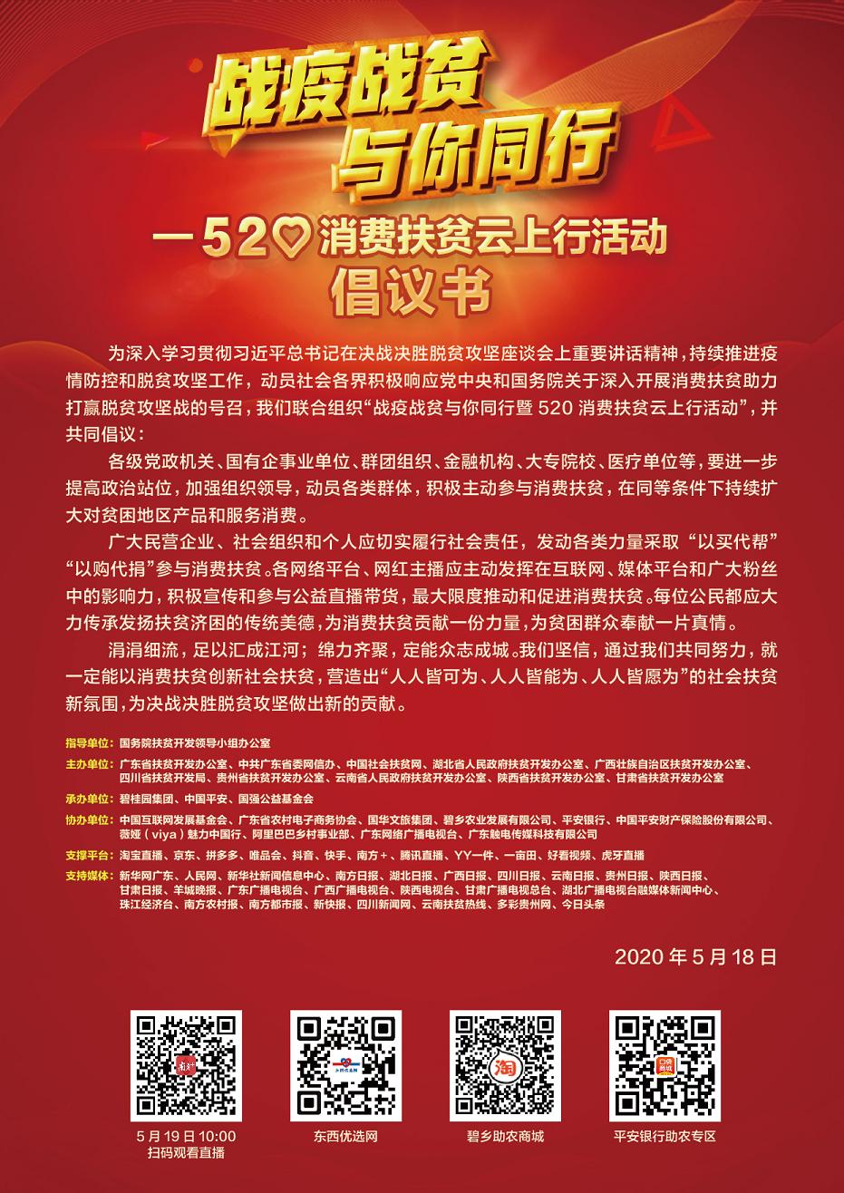 四川新闻网成都5月18日讯 为深入学习贯彻习近平总书记在决战决胜脱贫攻坚座谈会上重要讲话精神,持续推进疫情防控和脱贫攻坚工作,动员社会各界积极响应党中央和国务院关于深入开展消费扶贫,助力打赢脱贫攻坚战的号召,我们联合组织“战疫战贫与你同行暨520消费扶贫云上行活动”,并共同倡议: