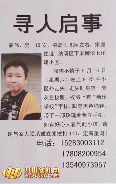 “爸爸,我出去玩一会儿。”胥清凤告诉四川新闻网记者,5月16日是星期六,弟弟屈伟在家写完作业后,晚上9时许,取得爸爸同意后,就出了家门。“弟弟很乖,学习成绩也很好,离家时没与家人吵架,也没有任何异常。”