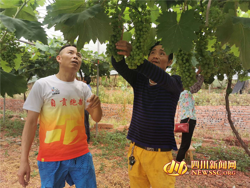 四川新闻网自贡5月26日讯(缪一 尚永高 记者 徐昭磊 摄影报道)5月25日下午,雨后的尖山空气清新怡人,在自贡市自流井区荣边镇尖山拾翠园的“扶贫车间”里,一派忙碌场景。农场主、民营经济人士张大洪正带着10多名脱贫户给葡萄打枝疏叶。在他们身后,满山坡的葡萄架上,已经挂满了青色的葡萄。“还有一个多月,葡萄就要成熟了,不少城区的游客已经来这里打探。”张大洪笑着说。