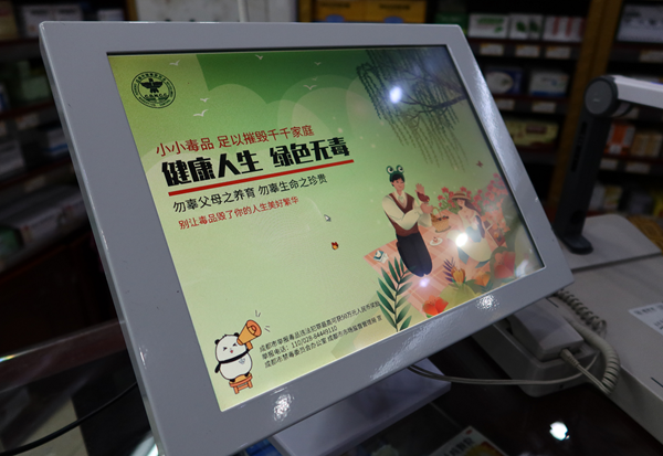 6月1日,在总府路1号成都同仁堂药店,记者看到该系统的显示屏上下循环播放一幅禁毒宣传图片。店里正在买药的市民王先生告诉记者,“一进来自己注意到这些宣传图片,吸毒太可怕了,那些被毒瘾折磨死的人太惨了,搞的人家破人亡。”另一位市民李女士也表示这种宣传方式很接地气,“现在新型毒品防不胜防,看完这个我也涨了不少知识,可以让每一个到药店的市民感受到禁毒宣传的浓厚氛围,在潜移默化中受到启发和教育。“