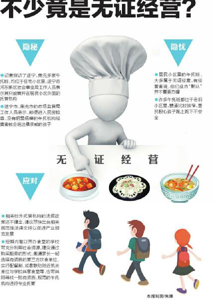 从南充市高坪第七小学家长“变身”为附近午托班老板,张女士讲述了自己的“心酸”办证史。“因为要从事经营活动,所以我需要先去市场监管局办理经营许可证,后来又因为要提供餐饮服务,需要去食品药品监管部门办理餐饮服务许可证,据说还要办理环保许可、从业人员健康证等,需要提供多份材料,等待时间很长。”张女士说,“太麻烦了,一想到大家都没证就开班了,我也就干脆不办了。”