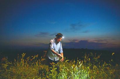7月2日夜晚,渠县望江乡尖山村的村民戴着头灯在星空下采摘黄花菜。