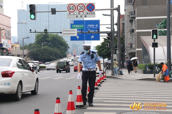7月6日下午,成都七中林荫校区考点外,成都交警一分局安排警力对考点周边进行保障