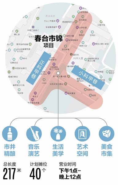 春台市锦位于正科甲巷、小科甲巷区域,处于活力区中心位置,总长度217米,共40个摊位,集市井精酿、音乐演艺、生活美学、艺术空间、美食市集为一体,每天将从下午1点营业至晚上12点。“通过多种类最in的主题集市,为科甲巷导入人流,形成引人入胜的春熙后街文化小巷,以此来打通春熙路步行街的‘毛细血管’。”
