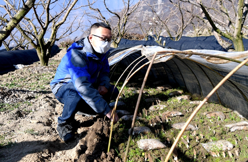 省林草局帮扶干部钟毅在地里查看羊肚菌种植情况