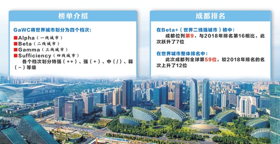 由全球化与世界城市研究网络(GaWC)发布的最新2020年世界城市榜单,成都位居世界二线强城市(Beta+)榜第9位,较2018年上升了7位,成为唯一入选Beta+榜的中国城市,而在世界城市整体排名中,成都的排名跃升至全球第59位。