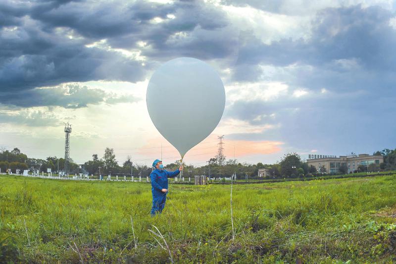 8月19日,温江国家基准气候站工作人员在释放探空气球