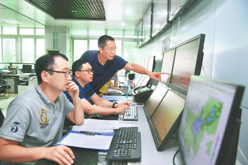 8月23日,四川省气象台首席预报员吕学东(右一)通过气象云图判断天气状况