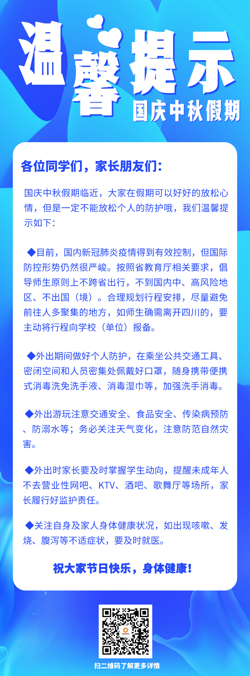 四川新闻网成都9月25日讯(记者 陈淋)国庆中秋双节假期即将到来,9月25日,成都市教育局官方微信公众号“成都教育发布”发布了温馨提示,按照省教育厅相关要求,倡导师生原则上不跨省出行。不到国内中、高风险地区,不出国(境)。合理规划行程安排,尽量避免前往人多聚集的地方,如师生确需要离开四川的,要主动将行程向学校(单位)报备。