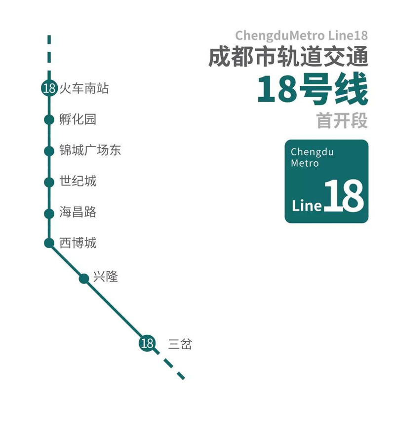 18号线作为成都市“东进”战略上首条主动脉,线路首次联通成都市主城区、天府新区与东部新区及天府国际机场,对整体优化成都市“东进”交通网络布局具有重要意义。本次开通的18号线北起火车南站,沿天府大道东侧向南敷设,经环球中心、世纪城、麓山至天府新区博览城片区,之后穿越龙泉山向东至三岔湖片区,全长55.95公里,共设9座车站,其中高架站1座,地下站8座,换乘站5座。