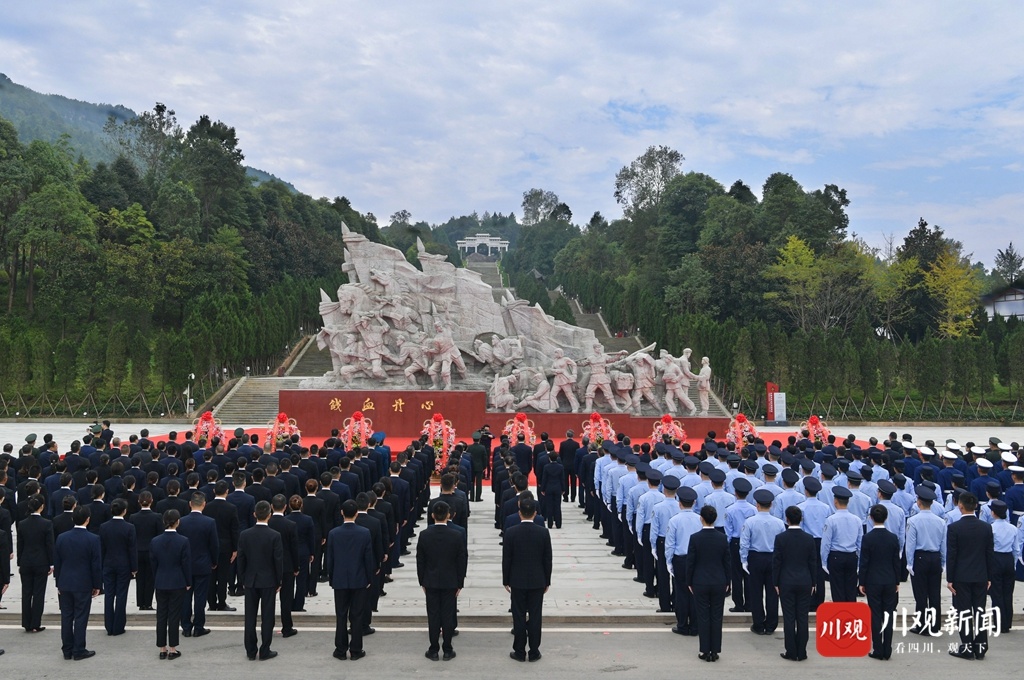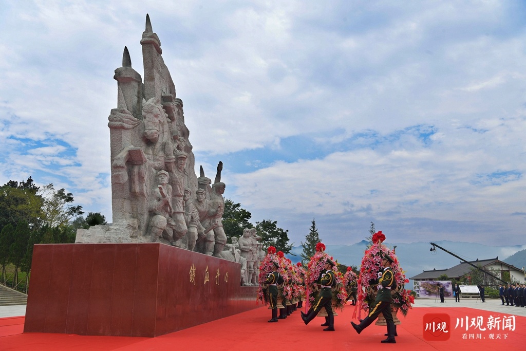 队列方阵前,9个大型花篮一字排开,花篮红色缎带上书写的“烈士永垂不朽”金色大字格外醒目。花篮分别由中共四川省委、省人大常委会、省政府、省政协、驻川解放军和武警部队、各民主党派省委和省工商联及无党派人士代表、巴中市四套班子和各人民团体及各界群众、老战士和烈士遗属、中国少年先锋队敬献。伴随着深情的《献花曲》,18名礼兵抬起花篮缓步走向主题雕塑,将花篮轻轻摆放到雕塑前。
