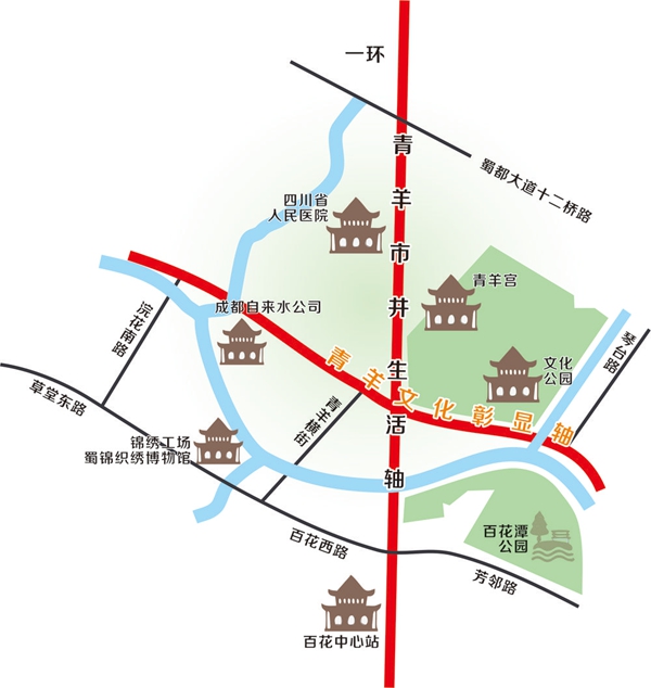 如果说一环路青羊区段沿线是传统文化集中地,那横贯这段路的二十里寻香道则可视为历史在延续,新时期文化场景在创造。一横一纵,构筑了青羊故事的一环展现。
