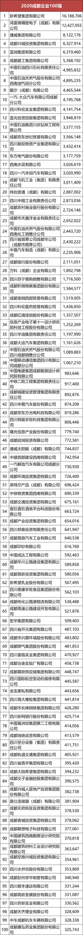 四川新闻网成都11月9日讯(记者 张宇)11月9日,记者从成都市经信局获悉,成都企业联合会等单位于近日发布了2020成都百强企业榜单。