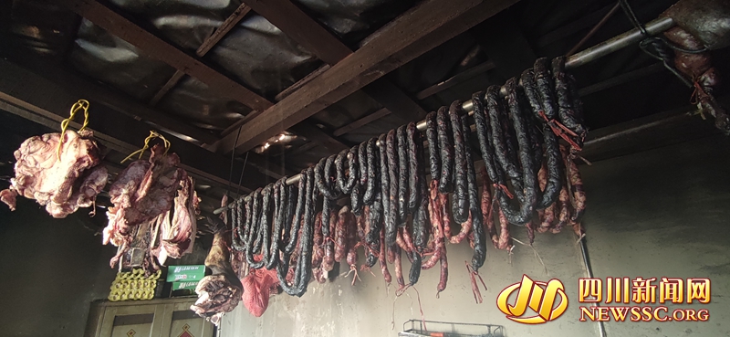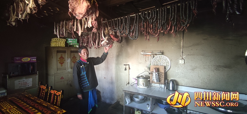 吉地尔子家今年彝族年杀了两头猪,家里挂满了香肠腊肉