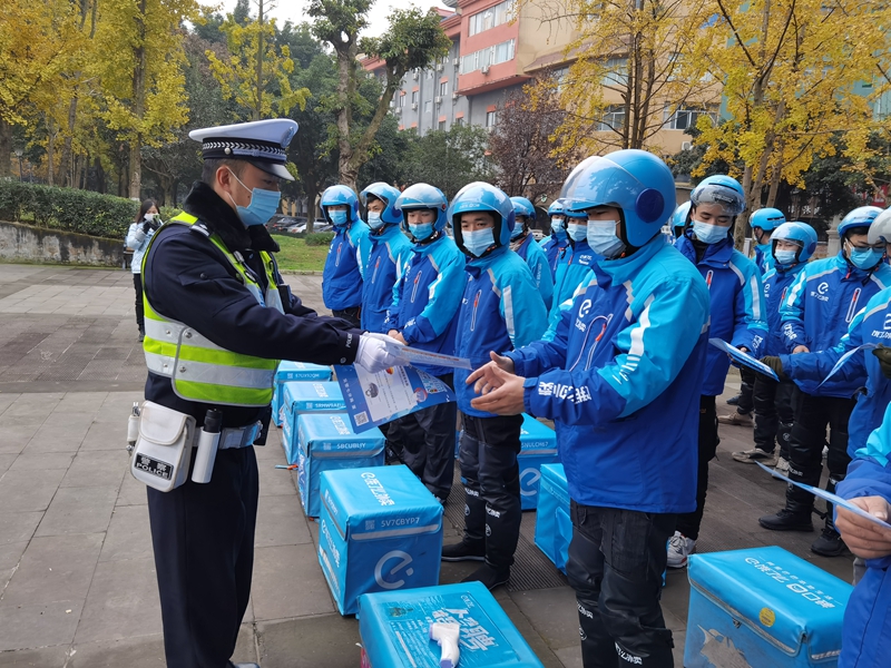 同时,结合外卖骑手因工作性质天天与时间赛跑,增加了发生交通事故的概率这一实际情况,12月10日上午,天府新区交警组织辖区内外卖企业骑手们开展了集中宣传引导,强调佩戴安全头盔的重要性。骑手们也在现场表示:“戴头盔主要是保护自己,骑车的时候特别是雨天路滑,如果发生了交通事故,戴好头盔是保护自己最好的一种办法,有的人不喜欢戴头盔,建议还是戴好头盔……”