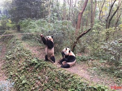 12月13日中午12点30分左右,一声隔了一二十米都如在耳边的四川话“这儿”,成都大熊猫繁育研究基地(以下简称“熊猫基地”)的树林里一阵哗哗作响,林间几道黑白影跑过。几秒之后,三只大熊猫出现在室外活动场边,接过一根两米多长的竹竿递来的窝窝头和苹果,就地或坐或躺,开始享受美食。游客们纷纷拿出手机记录这有趣的一幕。
