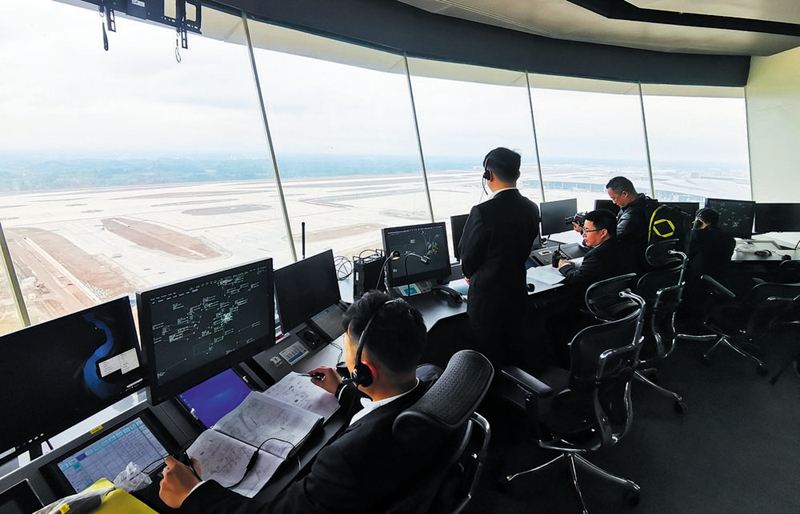 天府国际机场1号塔台,工作人员正在有序地忙碌