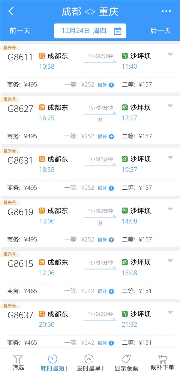 四川新闻网成都12月23日讯(记者 戴璐岭)12月23日,记者查询铁路12306发现,从12月24日起,成渝高铁部分车次的最短用时,将从目前的78分钟缩短到62分钟;这些车次均为成都东与沙坪坝之间“一站不停”的趟次,且采用“复兴号”运营。