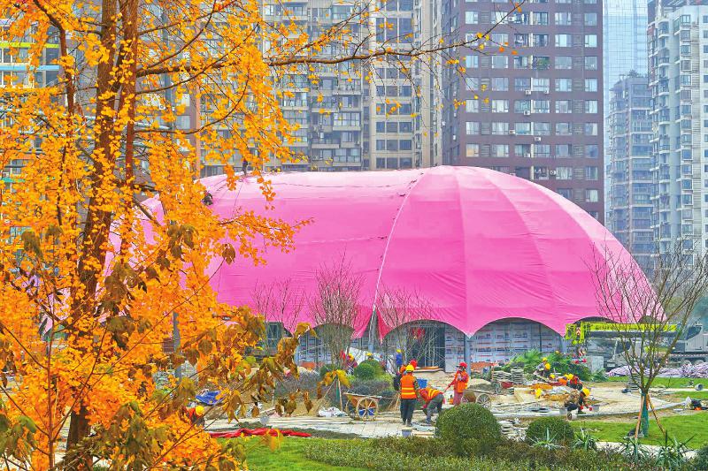 12月28日,成都一环路丝竹路旁的音乐坊正加紧完成收尾工程,音乐坊露天演出池和外观粉红的“巨蛋”室内演出厅已落成,绿化种植和道路施工正加班加点进行。音乐坊即将完成交付,成都市内又添多元演艺新场地。 四川日报全媒体记者华小峰摄