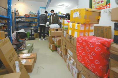 中通快递新都网点附近,有一家大型女鞋电商基地——国际美博城。这里一二楼主要是工厂店,5楼是淘宝网商,仅中通快递一家,在美博城的日均揽件量就有1万多件。记者看到,商家在打包商品时,在鞋盒外套上大小合适的定制纸盒和防水袋,即可贴上快递单发货。