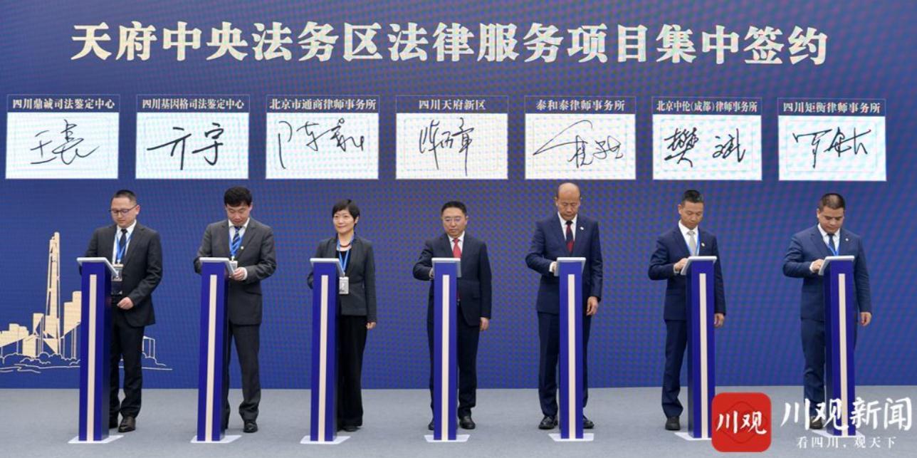 启动活动上,省委常委、政法委书记邓勇致辞,省委常委、成都市委书记范锐平和省委常委、副省长罗文启动天府法务网站,四川天府新区管委会与11家入驻天府中央法务区的法律服务机构代表签署全面合作协议。