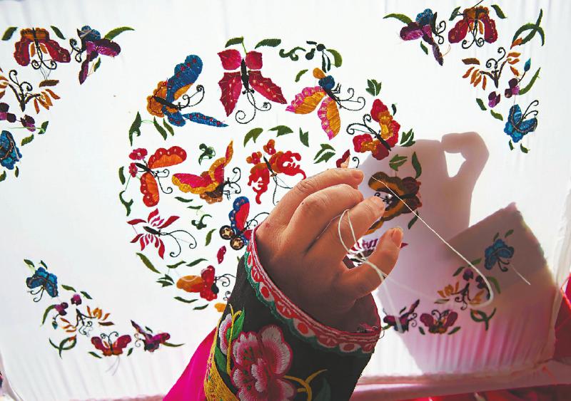 在杨华珍指导下,女学员们用灵巧双手飞针走线,白布上渐渐呈现出“蝶舞花间”图案雏形