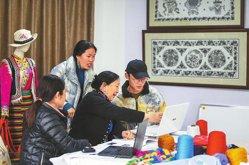 杨华珍(右二)组织设计师、艺术家和传承人共同进行跨界设计,开发藏羌织绣文创产品