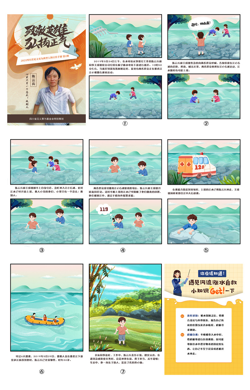 为进一步落实《四川省保护和奖励见义勇为条例》,激励先进、树立典型,大力宣传见义勇为模范英勇事迹。近期,由四川省见义勇为基金会联合四川新闻网策划推出的《2021四川省见义勇为典型人物宣传手册》正式出炉。宣传手册以九宫格漫画的形式,生动还原见义勇为典型人物在事发当时的情景,让大家全方位了解事件,走近英雄。在漫画的最后,还特别增加了见义勇为小知识,告诉大家如何在帮助别人的情况下也保护好自己,或者民众自己遇到需要帮助的各种情况应该怎么合理应对。