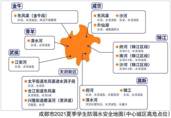 在暑假即将到来之际,成都市教育局联合市、区两级水务部门,通过大量调查走访,从河流、湖泊、水库、塘堰等水域的水流特点、危险系数和近年来的溺亡人数等角度出发,总结梳理出了各区(市)县的高危点位,以提醒广大学生和家长提高警惕,远离这些危险水域,更不要去野泳,以防止溺亡事件的发生。