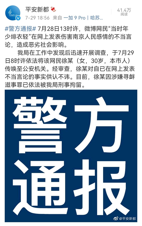 四川新闻网成都7月29日讯(记者 乔永祯)7月29日,成都市公安局新都区分局发布消息称:7月28日13时许,微博网民“当时年少绯衣轻”在网上发表伤害南京人民感情的不当言论,造成恶劣社会影响。新都区分局在工作中发现后迅速开展调查,于7月29日8时许依法将该网民徐某(女,30岁,本市人)传唤至公安机关。经审查,徐某对自已在网上发表不当言论的事实供认不讳。目前,徐某因涉嫌寻衅滋事罪已依法被分局刑事拘留。(图片来源于成都市公安局新都区分局官方微博)