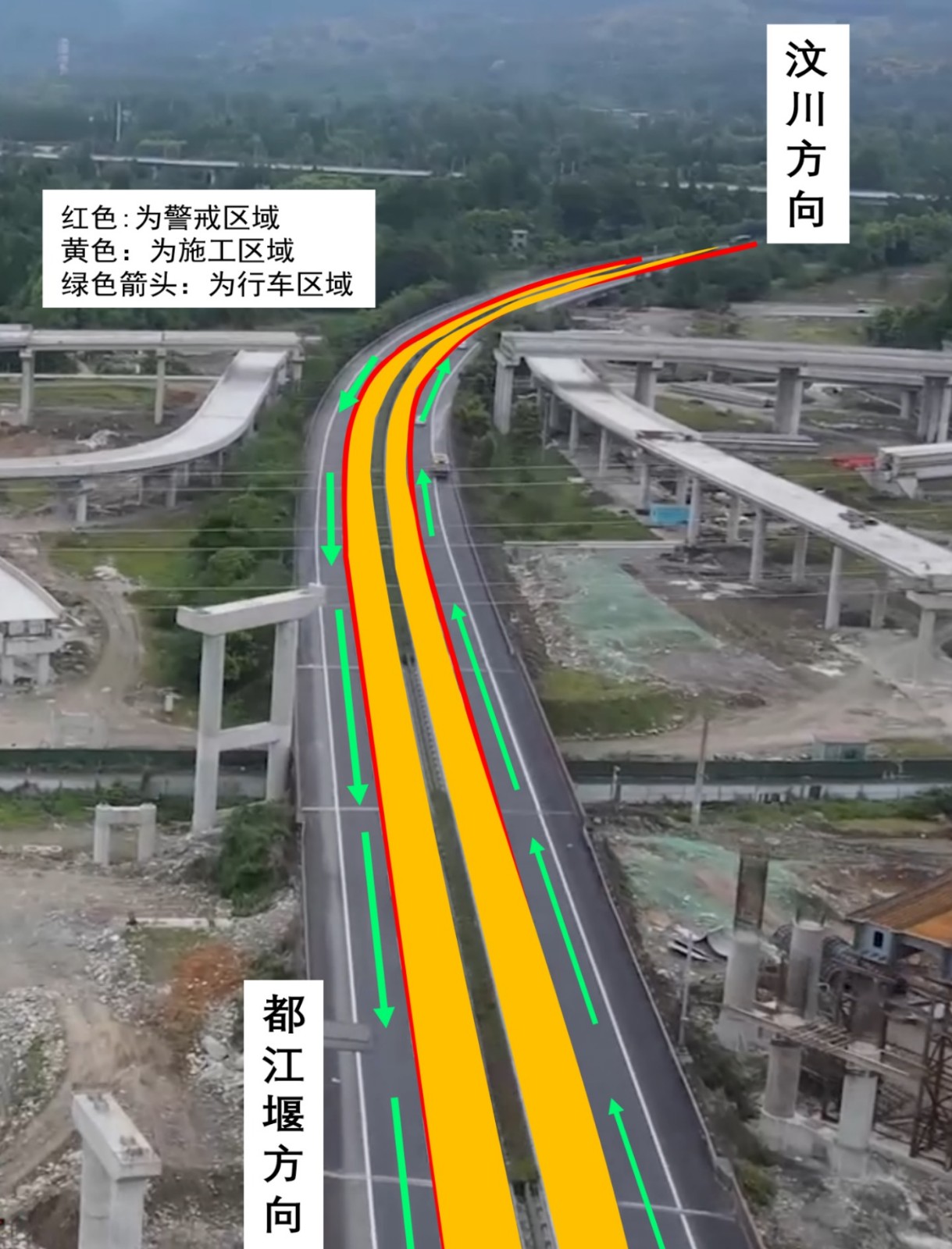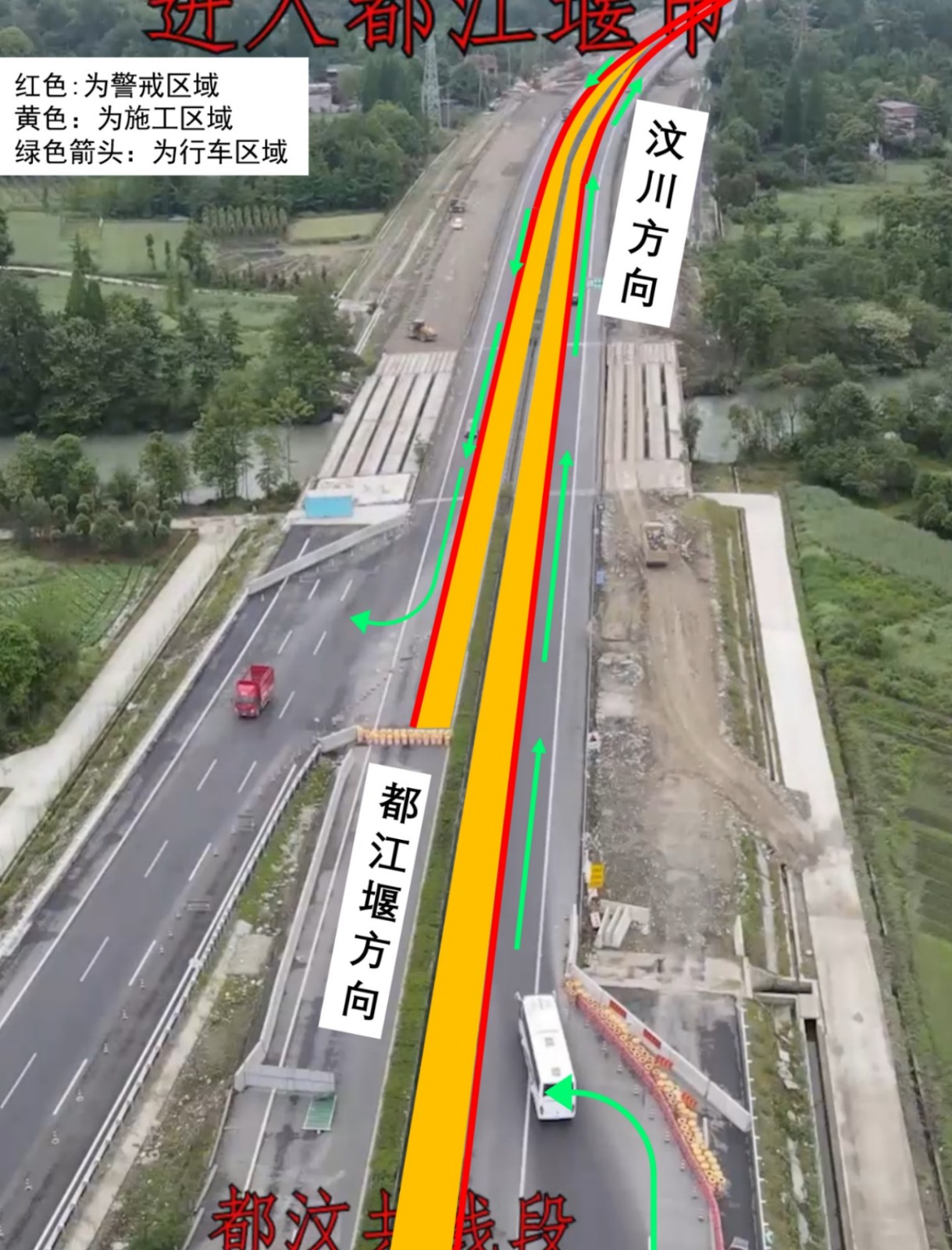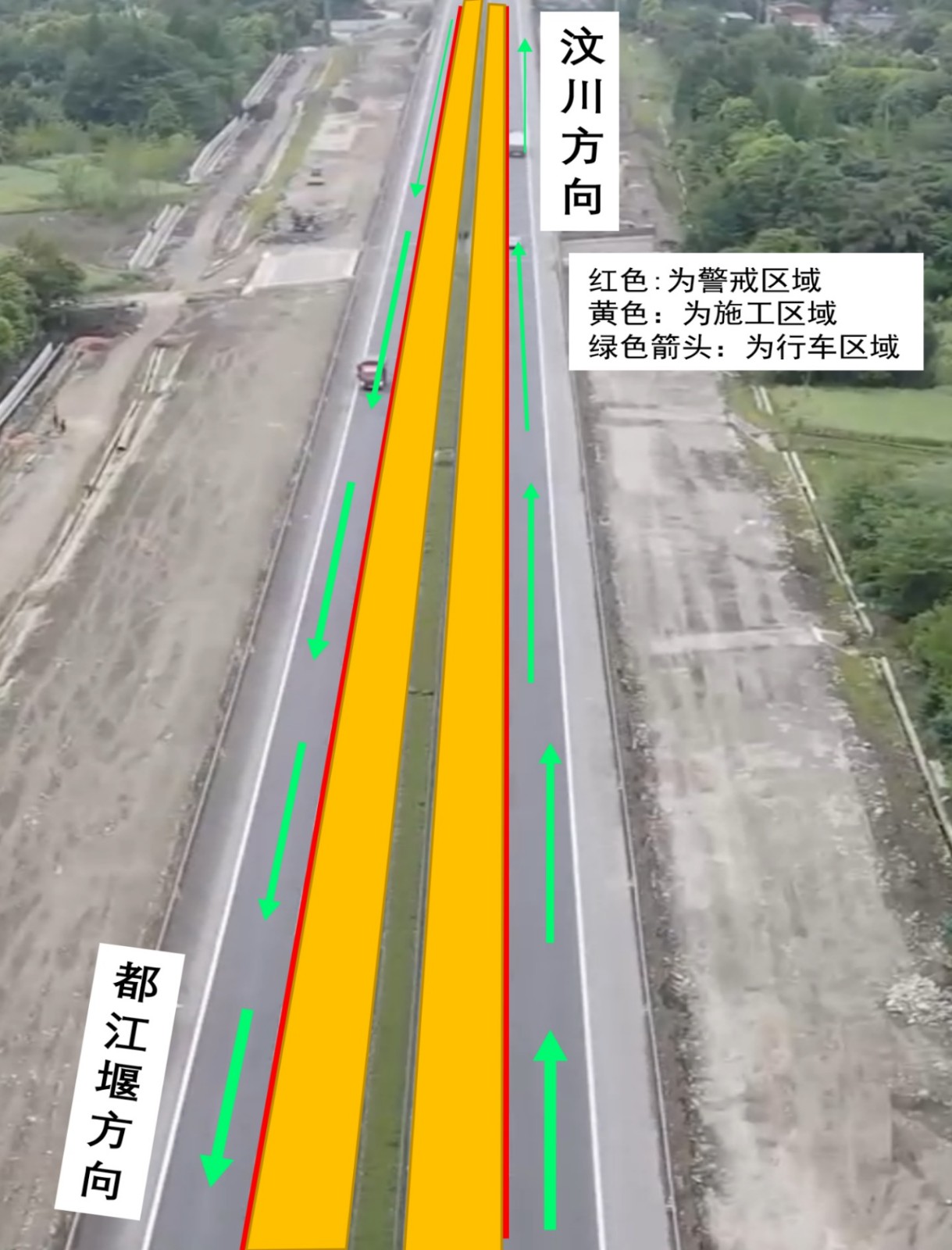 8月18日至9月10日,分段封闭都江堰至汶川和汶川至都江堰方向小客车道,原需经被管制路段的车辆借用客货车道和应急车道通行;8月25日至9月17日,分段封闭都江堰至汶川和汶川至都江堰方向客货车道和应急车道,原需经被管制路段的车辆借用小客车道通行。