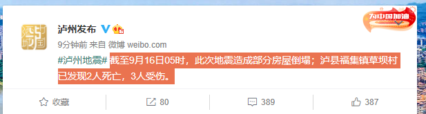 截至9月16日05时,此次地震造成部分房屋倒塌;泸县福集镇草坝村已发现2人死亡,3人受伤。