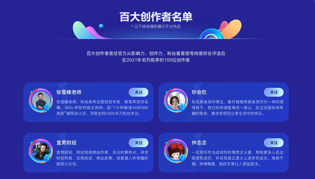 10月19日,百家号在五周年之际发布了“百度2021百大创作者”榜单,榜单综合考量了创作者的平台贡献力、行业影响力、内容优质度、用户喜爱度等多个维度,涵盖美食、科技、教育、财经、家居、健康、科普、文化等20多个垂类领域,整体呈现泛知识、泛生活、泛资讯、泛娱乐属性;在特征上,普遍具有独特的内容和个人风格,人格化趋势明显。