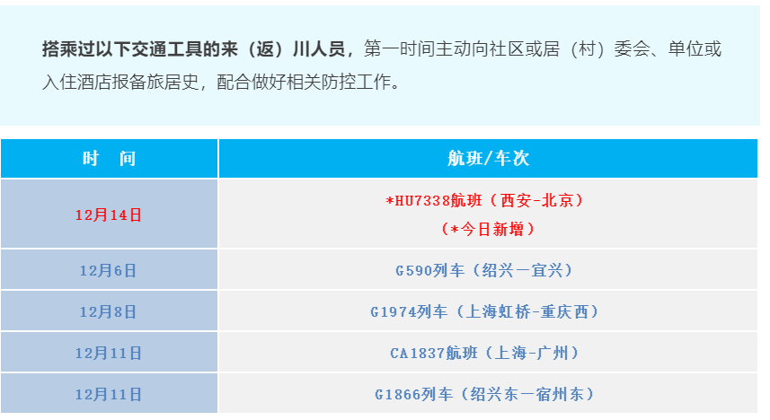 搭乘过这些交通工具的来(返)川人员,第一时间主动向社区或居(村)委会、单位或入住酒店报备旅居史,配合做好相关防控工作。