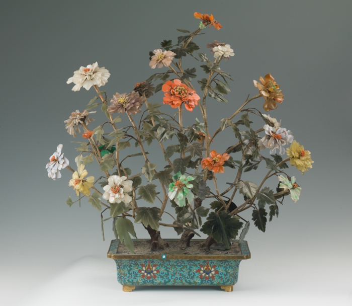本次展览中,两件精致典雅的清代铜胎掐丝珐琅聚宝盆亦将闪耀亮相。清代宫廷多喜好奢华的宝石花卉盆景装饰室内空间,这两件“聚宝盆”便是此类盆景。它们以铜胎湖蓝珐琅釉为花盆,盆中各类宝石雕琢的花卉簇锦,花枝盈满,精巧细腻,色彩纷呈,呈现出欣欣向荣的富贵繁茂之态,也凝聚着吉祥如意的美好寓意。
