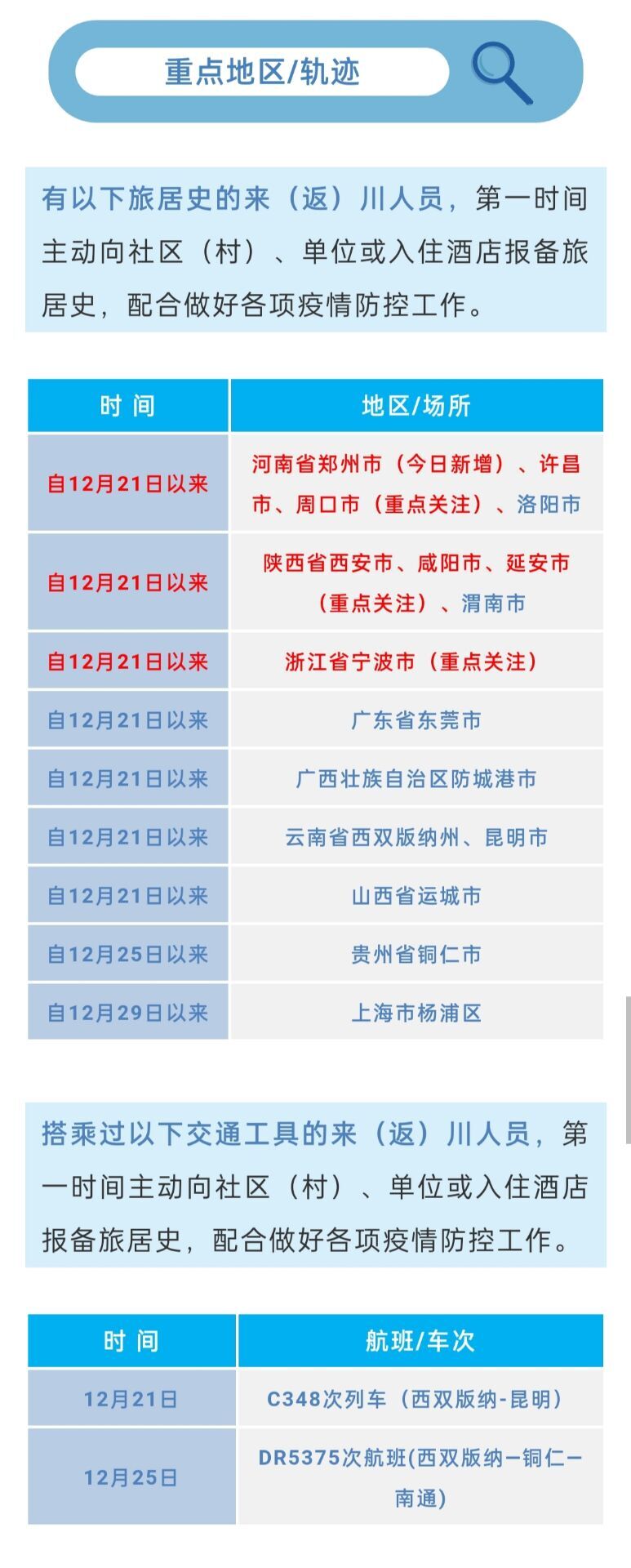 三是1月4日新增对12月21日以来,有河南省郑州市管城回族区、二七区,周口市太康县旅居史的入(返)川人员实施居家或集中隔离,每3天进行1次核酸检测,直至离开旅居地满14天为止。