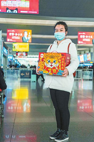 礼物:“虎虎生威”礼盒 旅途:成都—金堂 1月27日,26岁的叶娅玲拿着公司发的“虎虎生威”礼盒回家。2018年留学归来的她因为想念爸爸亲手做的糖醋鱼,连续4年都回家过年。