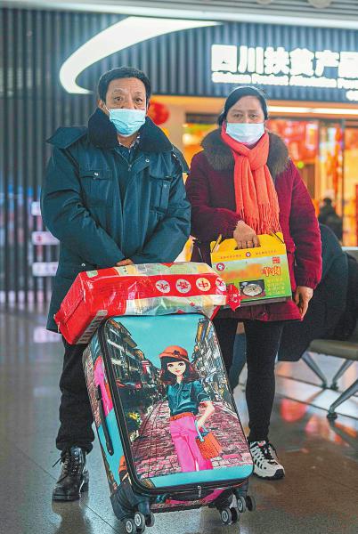 礼物:羊肉汤、腊肉 旅途:简阳—贵州 1月26日,61岁的曾文君(左)和妻子谢永秀临行前往皮箱里塞满了腊肉,还装了四盒密封好的羊肉汤,好让在贵州上班的儿子吃到家乡的味道。