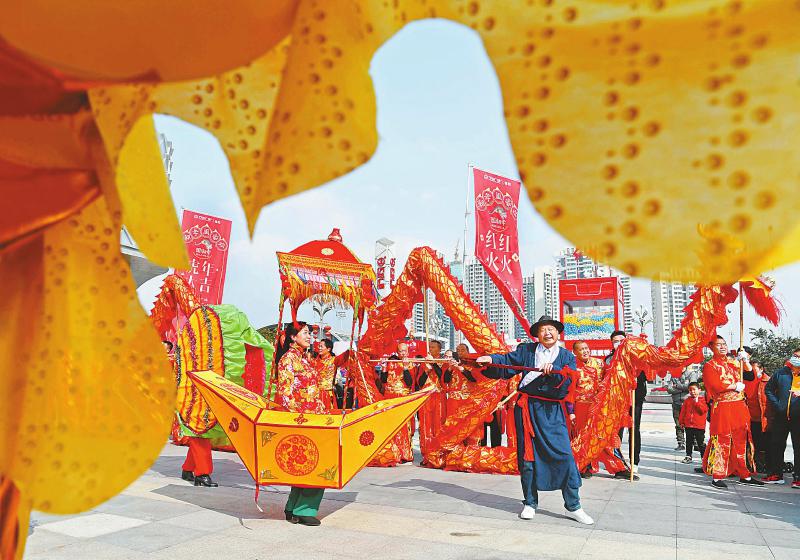 2月15日,德阳市旌阳区举行“我们的节日·欢乐过元宵”传统文化系列展示活动。图为采莲船表演。记者 肖雨杨 摄