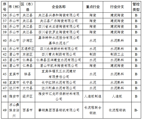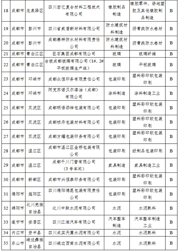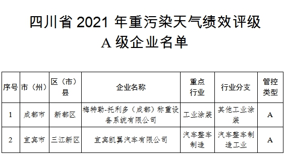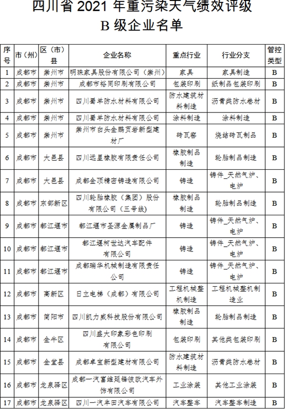 川观新闻记者了解到,为积极有效应对重污染天气,进一步突出精准治污、科学治污、依法治污,按照生态环境部《重污染天气重点行业应急减排措施制定技术指南(2020年修订版)》等要求,四川省生态环境厅近期组织开展了2021年重点行业企业绩效评级工作,通过企业自评、市(州)初评、省级评定、意见征求和社会公示等环节,最终认定A级企业2家、B级(含B-级)企业49家、绩效引领性企业9家。