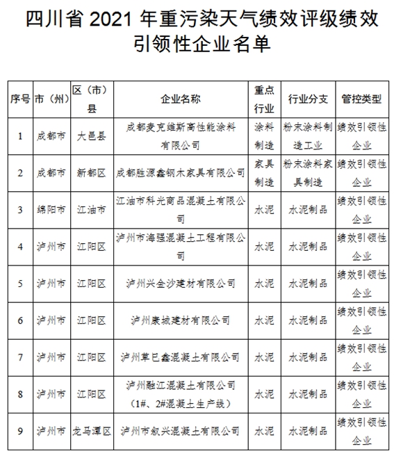2月18日,川观新闻记者从四川省生态环境厅获悉,近日该厅公布2021年四川省重污染天气重点行业企业绩效评级结果,认定A级企业2家、B级(含B-级)企业49家、绩效引领性企业9家。按照相关规定,上述60家企业在重污染天气期间可不停产限产。