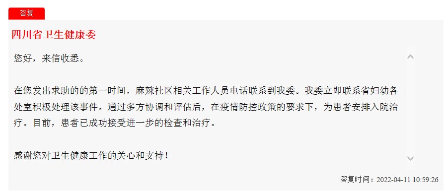 4月1日,网民求助当天,四川省卫健委立即受理了该诉求,并将网民反映的情况转至相关部门(单位)处理。随后,四川省妇幼保健院、乐山心连心服务中心、沐川卫健局加入到“紧急救助”之中。