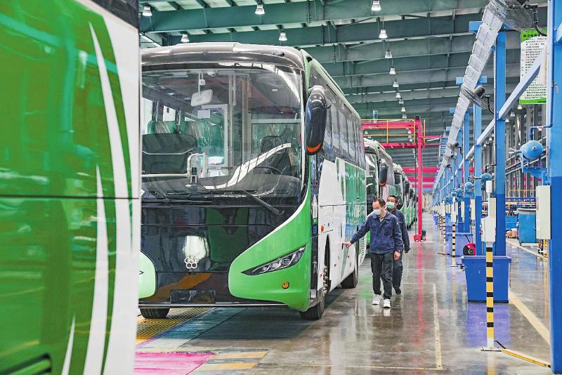 成都格力钛新能源有限公司,工作人员在检查为成都大运会定制的纯电动接驳车。